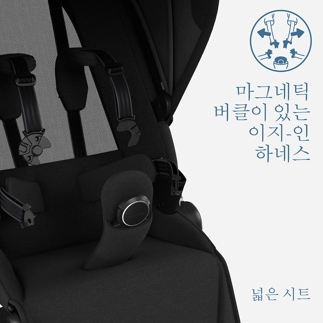 아이를 태우고 내릴 때 벨트가 꼬이지 않도록 열려 있는 페임의 이지-인(Easy-in) 하네스 덕분에 유모차 탑승이 그 어느 때보다 쉬워졌습니다. 마그네틱 퀵 락(Quick-lock) 버클은 설치를 더 빠르고 간편하게 만듭니다. 페임은 다양한 수납 옵션을 갖추고 있어 모든 필수품을 손이 닿는 곳에 보관할 수 있으며, 메모리 버튼을 사용해 손쉽게 시트 방향을 전환할 수 있습니다.